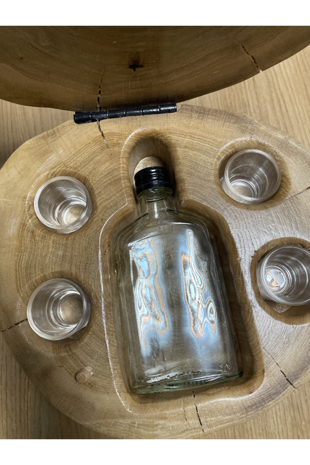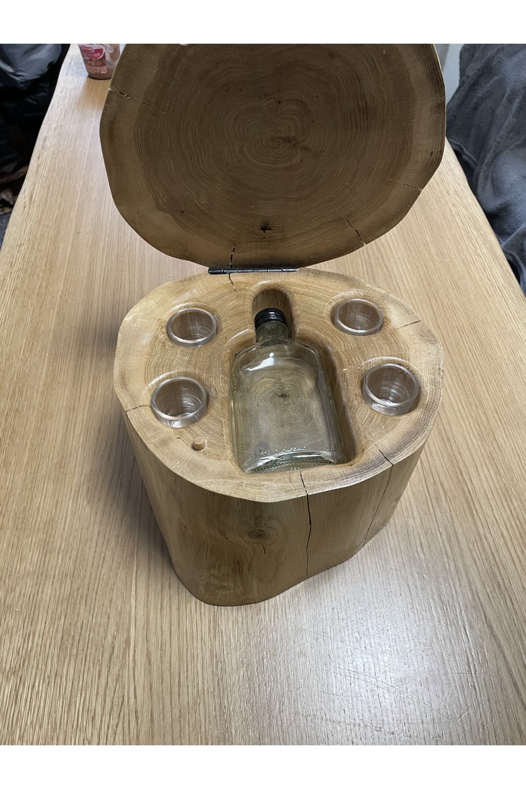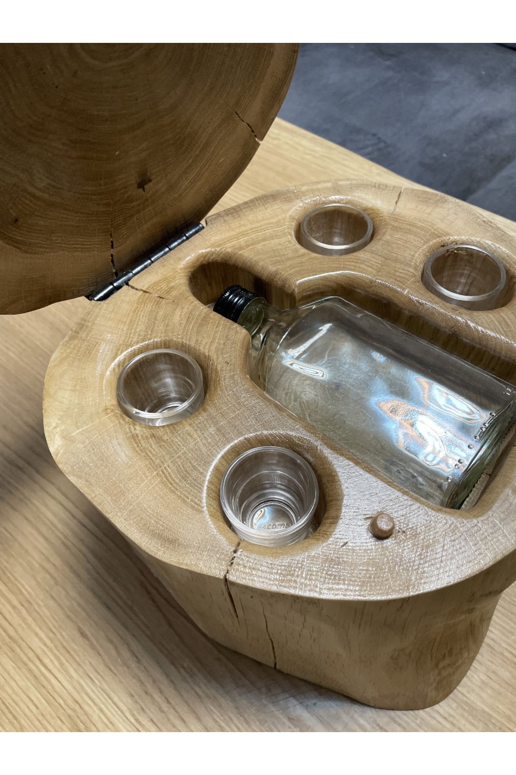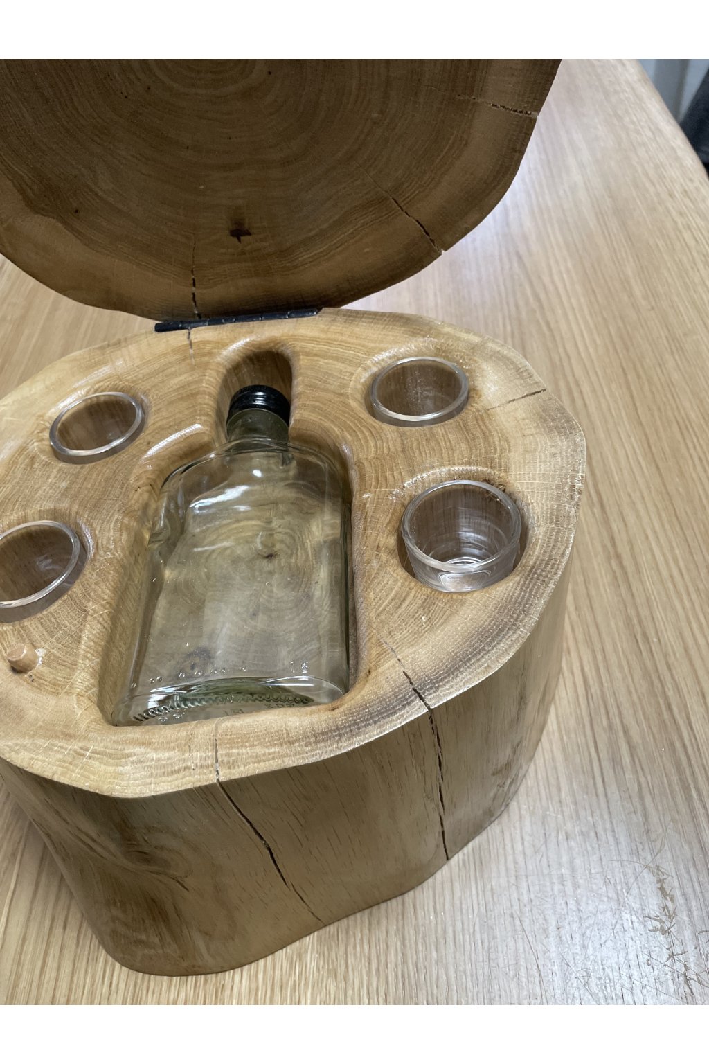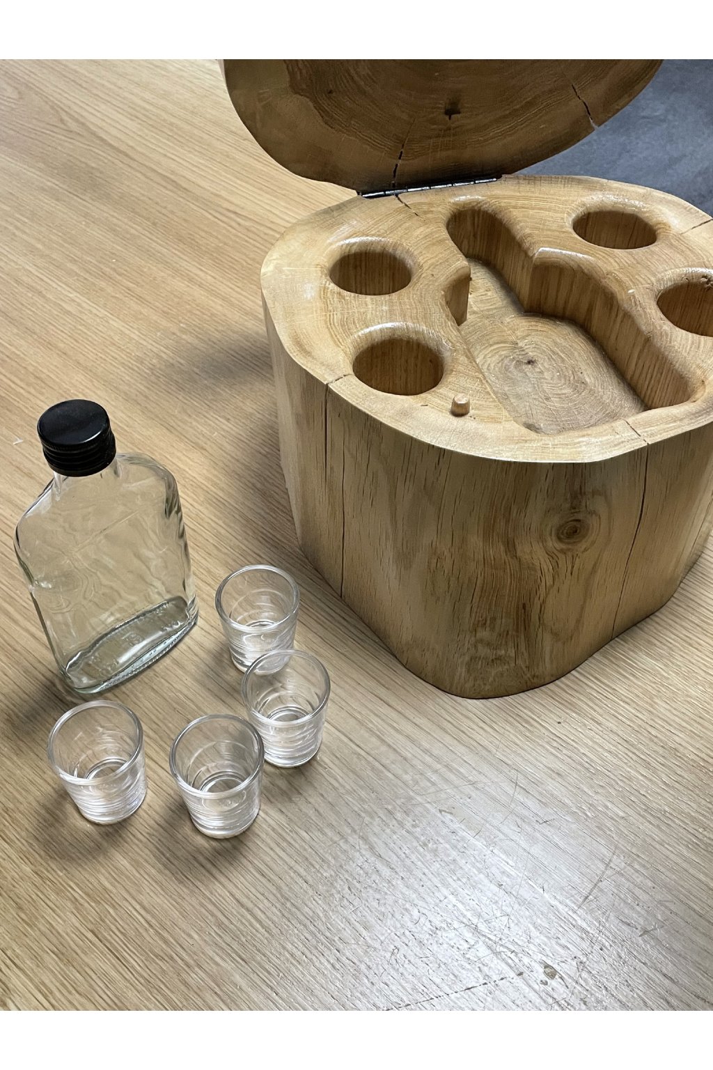 Ručně opravovaný dubový bar je dodáván včetně láhve 200ml a 4 kusy panaků